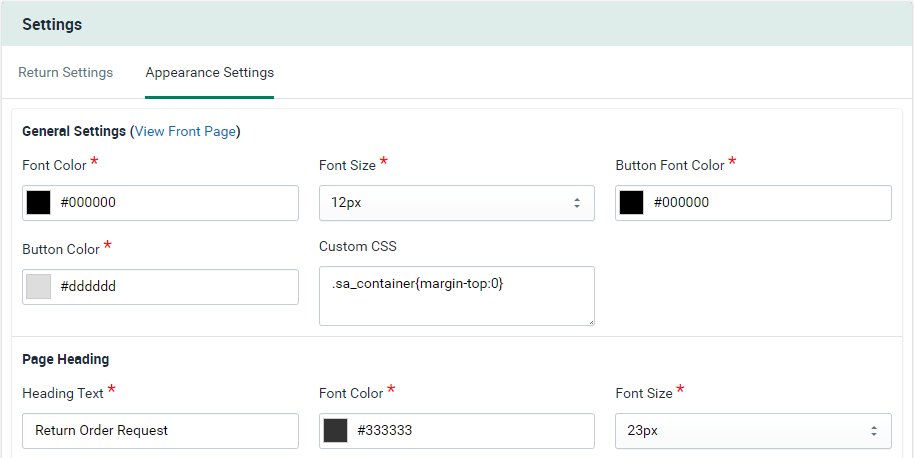 Set font color and size, page heading, order table settings for return request on the front side page.