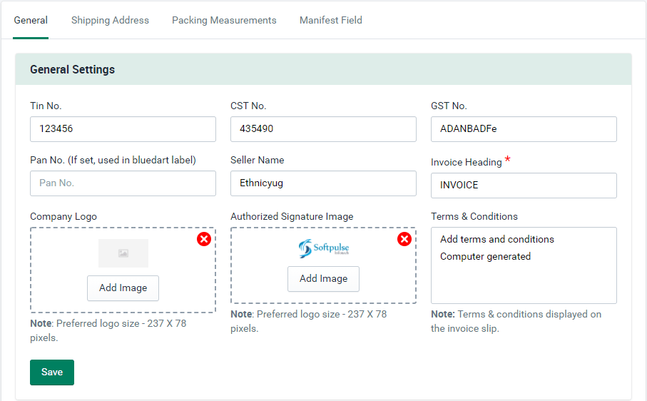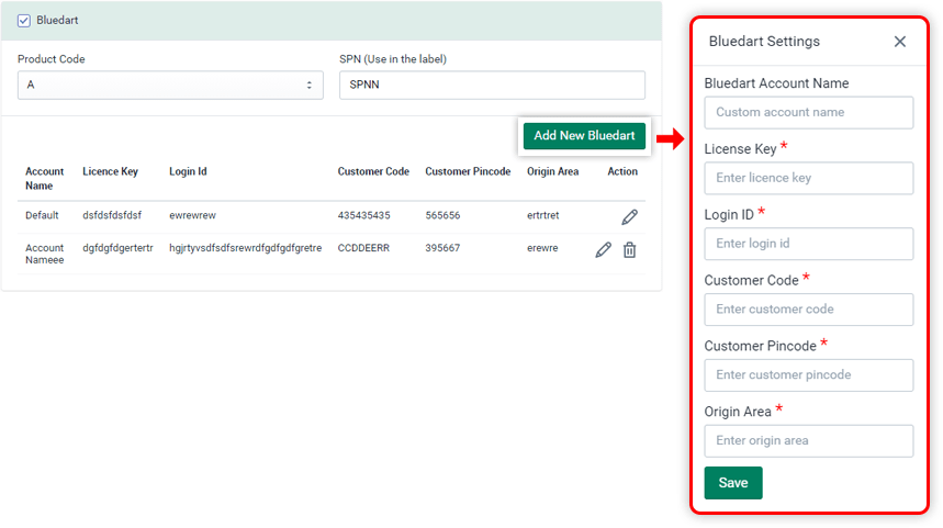Step 3 : Add account name, License key, Login ID, Customer code, Customer pincode, Origin area in blue dart settings form.