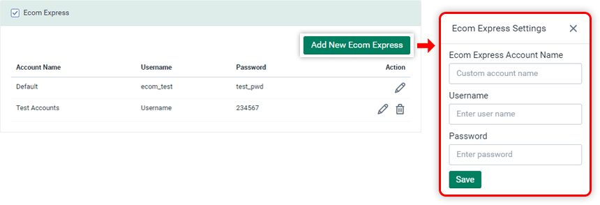 Step 3 : Add account name, username and password in Ecom Express settings form.
