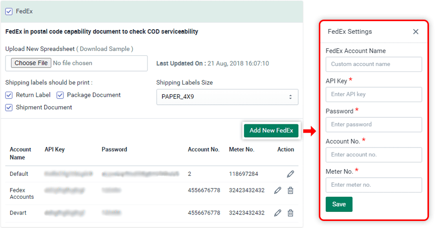 Step 5 : Add FedEx account name, API key, password, Account number, Meter number detailed setup in Fedex form.
