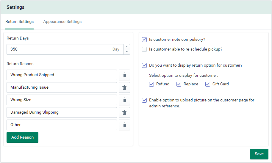Set return accept days after fulfillment and reasons for return which customers can select while requesting a return. Return order settings will be configured from the settings tab.